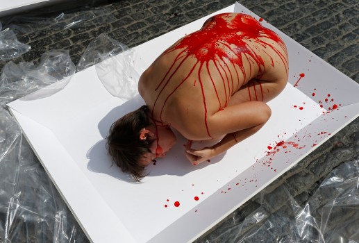 Viande fraîche: à Barcelone, en Espagne, c'est entièrement nus et recouverts de sang que des militants de l'organisation de défense des droits des animaux Anima Naturalis protestent contre la trop grande consommation de viande et les conditions d'élevage des animaux.